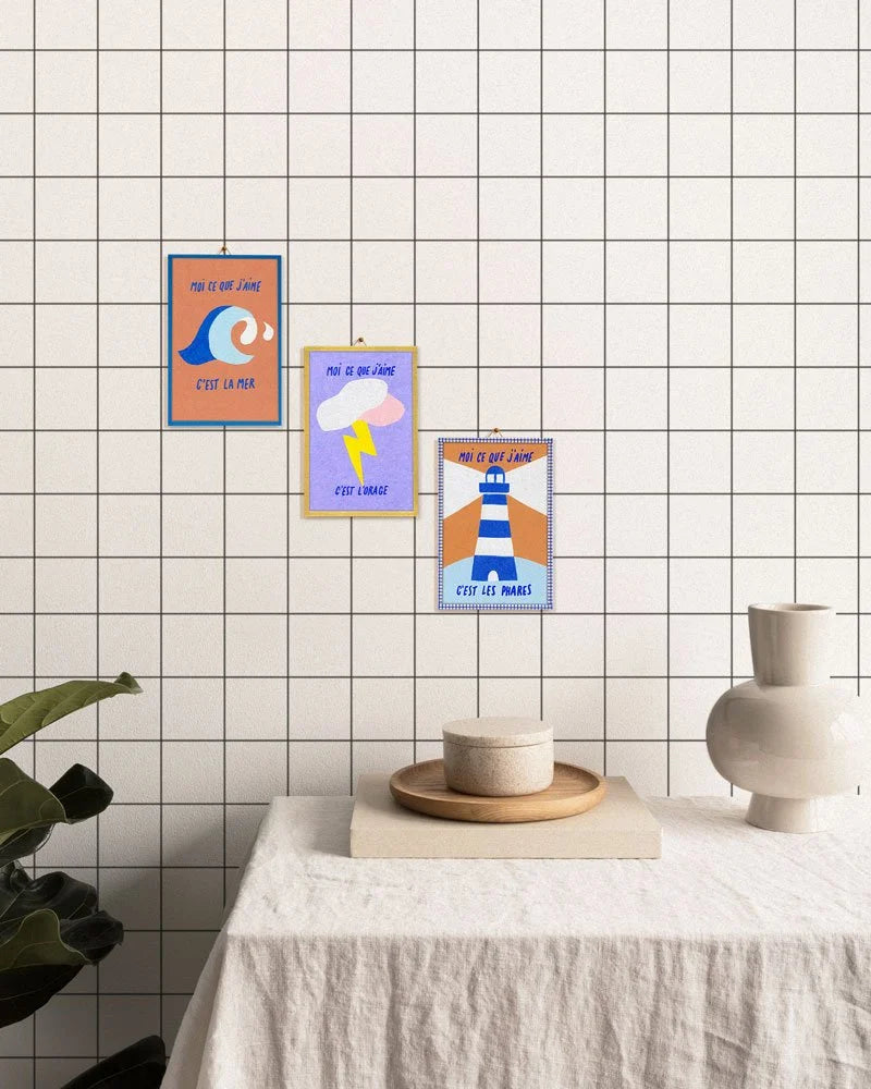 Chaque pièce est imaginée et dessinée par Élise Enjalbert, puis encadrée à la main pour être accrochée ou posée facilement.