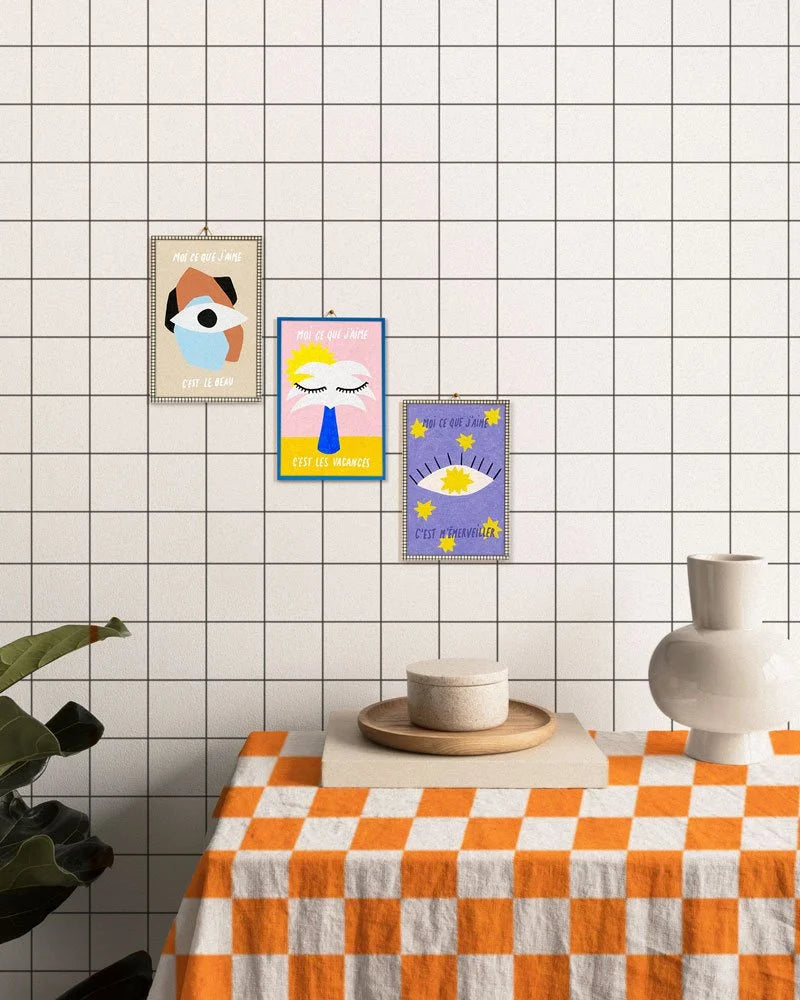 Pour une décoration pleine de bonne humeur, la collection “Moi ce que j’aime” est une valeur sûre. Ces illustrations originales d’Élise Enjalbert sont imprimées à Paris et encadrées à la main pour un rendu unique.