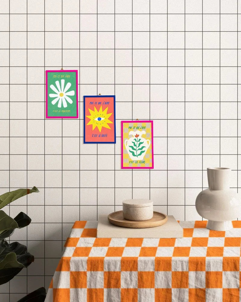 Parce que la décoration doit refléter ce qui rend heureux, la série “Moi ce que j’aime” met en avant des instants de vie simples et inspirants. Illustrations signées Élise Enjalbert, imprimées en qualité d’art à Paris et assemblées à la main.