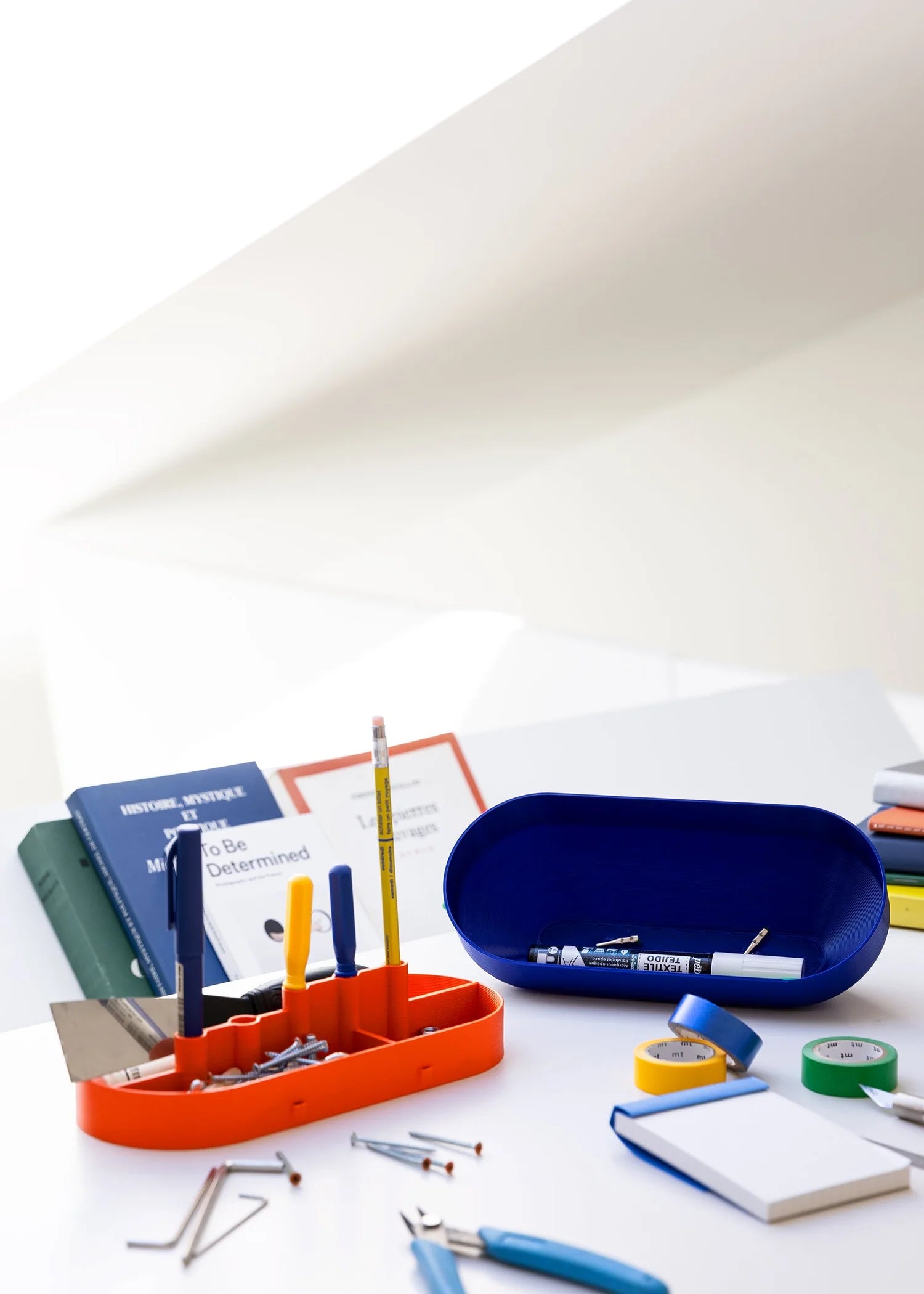 À la fois trousse, boîte à outils et porte-crayons, elle se compose de deux modules : la base, compartimentée pour ranger feutres, pinces, tournevis ou accessoires, et le “chapeau”, qui une fois retourné se transforme en vide-poche pratique. Les deux parties peuvent être utilisées séparément ou clipsées ensemble et maintenues fermées par des élastiques colorés. Grâce à ces élastiques, la toolbox peut être glissée dans un sac pour la transporter partout.